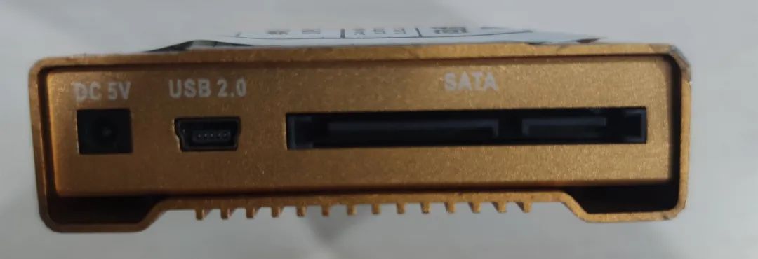 如下圖所示,從左至右分別是SATA接口、指示燈、USB2.0接口、開關以及一個DC IN+5V的電源接口。而我們平時用來下載存放電影或者各類文件資料的移動硬盤一般不會有這么多的接口和開關,畢竟使用場景和需求還是有一些差異的。