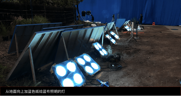 關于藍綠幕的打光問題,我們的棚高基本都是15米,為了讓藍綠幕上下的光均勻,我們在棚頂和地面各有一組給藍綠幕照明的燈具,燈光組把這些燈再加一層藍色紙去提高藍布的純度,然后把所有打藍布的燈串在一路接到電子數控臺上,根據不同的鏡頭再去調整它的亮度。我們這次美國的視效團隊有一個人專門負責現場視效技術,他會根據每個鏡頭攝影機所定的光孔數值,然后用測光表去控制藍綠幕的亮度,基本都在曝光點上下半檔左右。
