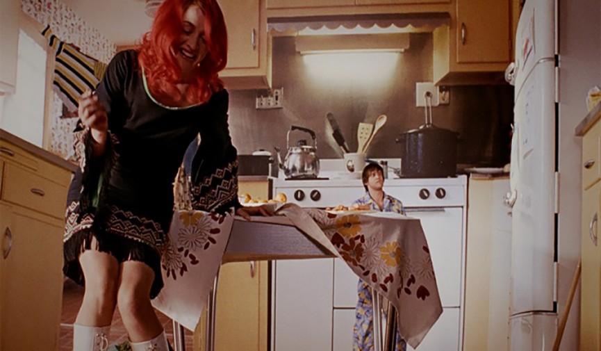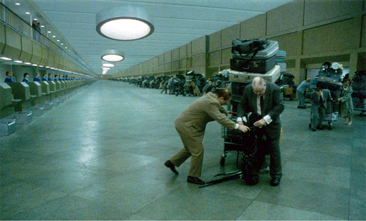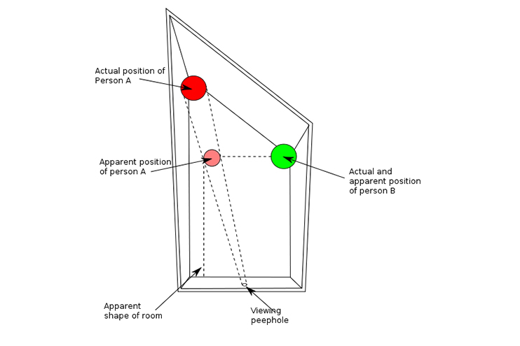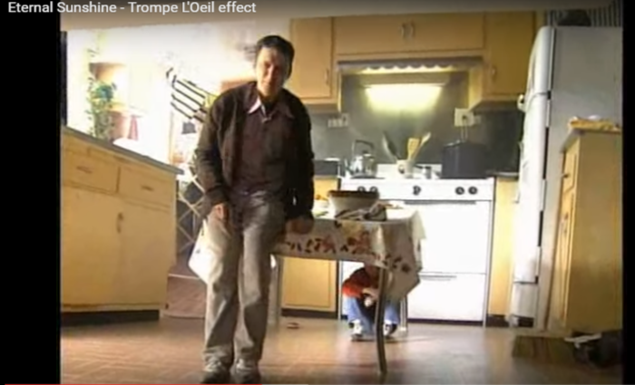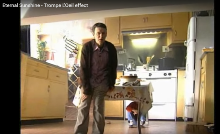 《美麗心靈的永恒陽光》里的錯覺是理解強制透視如何奏效的例子之一。通過在美術布置上使用一個扭曲,梯形的房間,使我們感覺房間里的人們似乎是不同的大小。