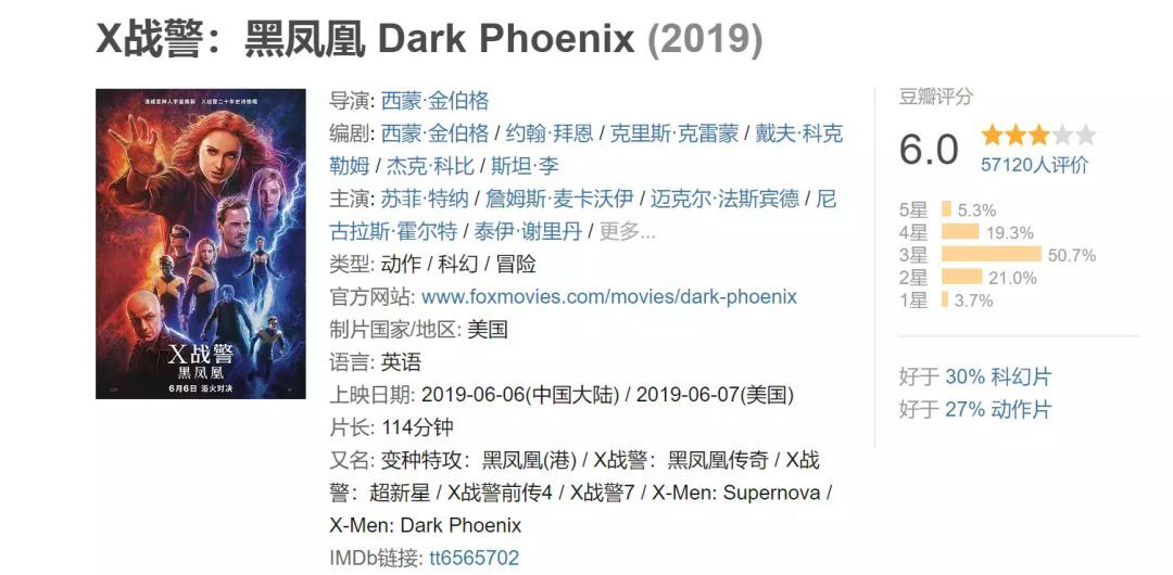 《X戰警:黑鳳凰》(以下簡稱《黑鳳凰》)于6月3日開始登錄全球院線,然而滑鐵盧來的太過突然。中國首日票房僅7900萬,最終國內預測票房在4.2億左右,而北美上映第三日的單日票房已低至820萬美元。豆瓣評分6.0,爛番茄新鮮度僅22%,讓近20年的《X戰警》電影系列備受屈辱。依照當前形勢,制片成本高達2億美金的《黑鳳凰》恐怕難以靠票房收回成本。