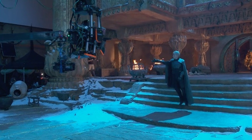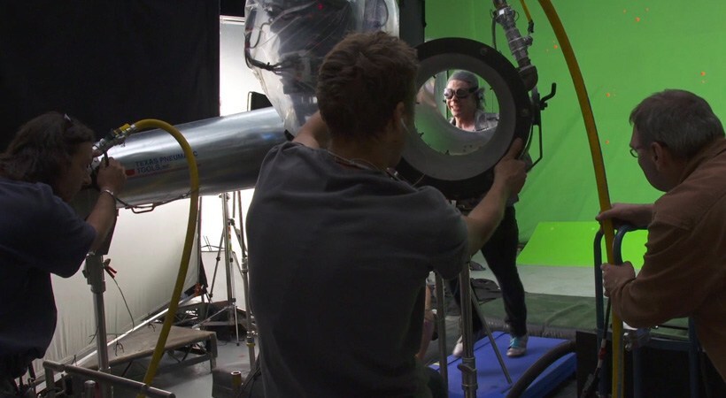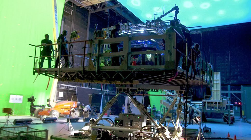 這個(gè)動(dòng)作是由場景中的旋轉(zhuǎn)設(shè)備完成的,它的機(jī)械臂同時(shí)抓住攝影機(jī)和演員。
