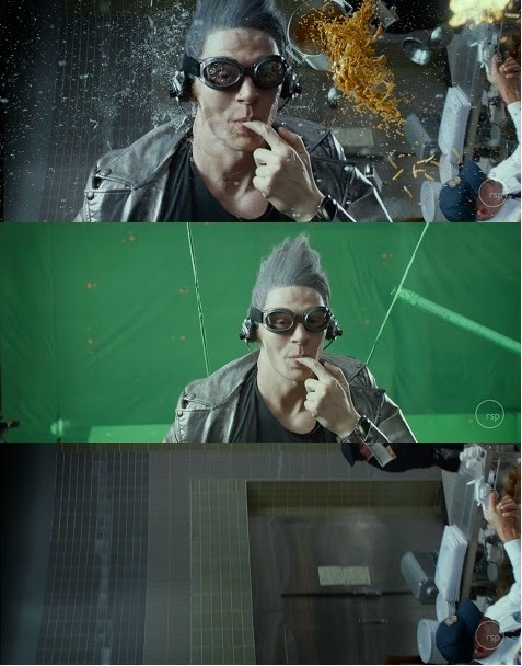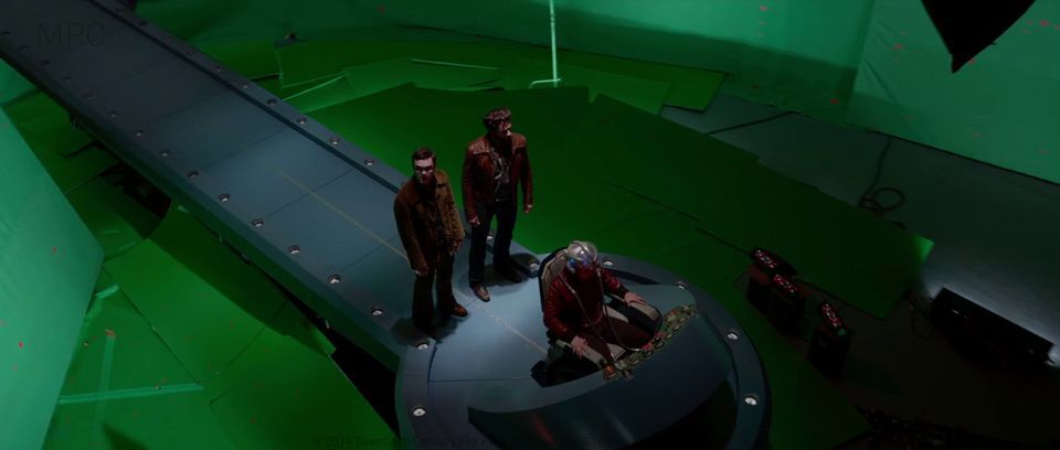 在完成片中有 1200 多個(gè)視覺特效鏡頭,其中大多數(shù)融合實(shí)拍和 CGI 元素。為了輔助拍攝,攝影組使用了一系列的專業(yè)工具,包括遙控的搖臂和程控升降車,可以更容易地拍攝運(yùn)動(dòng)控制鏡頭,被西格爾描述為“快速簡易設(shè)備”。此外,艾麗莎經(jīng)典攝影機(jī)被安裝到 Cameron-Pace 水下 3D 設(shè)備上,以拍攝金剛狼被萬磁扔到波托馬克河的鏡頭。“水下特別適合實(shí)拍 3D,因?yàn)槟莾嚎傆信菽⑵〉乃槠裁吹模苯芫S斯說“:這些鏡頭的立體設(shè)計(jì)費(fèi)時(shí)又費(fèi)錢。”在高潮段落,場景是 1973 年,尼克松總統(tǒng)在草坪上為“哨兵”雕像揭幕,在這里一場大戰(zhàn)即將爆發(fā)。考慮到在蒙特利爾地區(qū)沒有合適的內(nèi)景的替代場景,攝影組在搭好的綠幕前進(jìn)行了實(shí)拍,那兒被西格爾稱為“大箱子”。“大箱子”建在一塊草坪上,這片草坪在主攝影棚的附近。“我們知道要在草地上拍攝草坪,一側(cè)是電視攝像機(jī)的媒體臺(tái),另一側(cè)是總統(tǒng)和官員們的講臺(tái),”西格爾解釋說:“其余幾乎全是由 CGI 生成的。實(shí)際的是搭建一個(gè)我們自己的場地,大約 200×200 英尺,就是我們攝影棚旁邊。”“我們用 50 英尺高的集裝箱圍了一塊區(qū)域,在外面包上綠幕,”攝影師繼續(xù)說“:這個(gè)地方基本上是一個(gè)用集裝箱圍起來的院子。在綠幕前我們也有黑色窗簾,它們可以通過軌道移動(dòng)以避開攝影機(jī)上方綠幕的綠色漏光。在頂上,我們拉了一個(gè)電纜支架以支撐網(wǎng)格布,這個(gè)網(wǎng)格布以很低的角度固定在上方,為的是減小風(fēng)的影響,在天氣不佳的時(shí)候也可以擋雨。在院子外面有一條小路,我們可以用 LRX 照明塔來打光。這樣,根據(jù)拍攝角度,我們可以得到快速的、柔和的逆光,影像不會(huì)顯得太平。特殊的時(shí)候我們給其中一個(gè) LRX 裝上了 18K的燈,而不是通常的 12K,因?yàn)橐尮馔高^頭頂巨大的布。”并非每個(gè)場景都需要這樣的高科技解決方案。