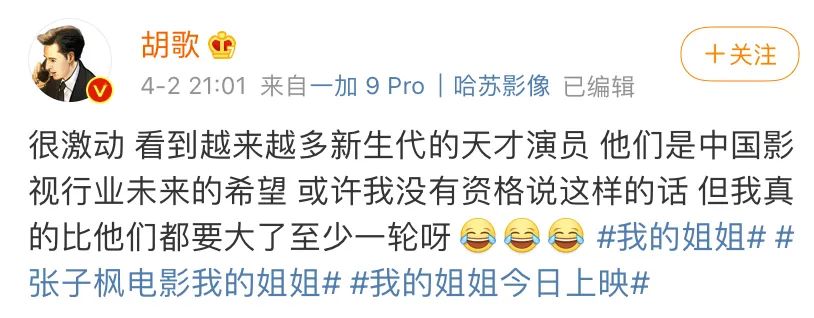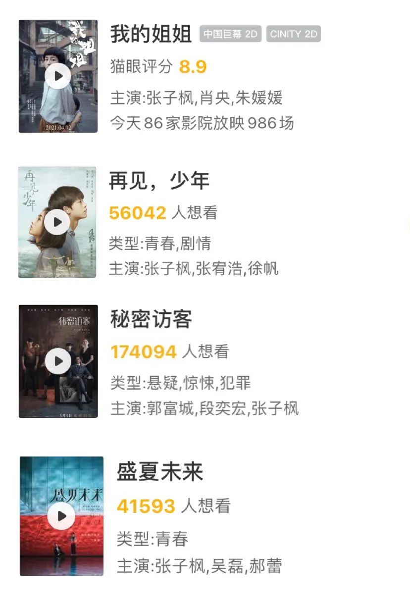 由她參演的五部電影,橫跨了倫理、懸疑、青春、愛情各種類型。正在熱映的《我的姐姐》,更被稱為清明檔的一匹黑馬。胡歌作為娛樂圈的老捧場王,看完易烊千璽的《小紅花》,發微博感慨。對于《我的姐姐》,他再次毫不吝嗇的夸贊了新生代的天才演員,更直言自己比她們大了快一輪。目前,張子楓的累計票房并不亞于白百合周冬雨等實力演員。從“國民妹妹”到“票房過億的姐姐”,她究竟是怎樣煉成的?