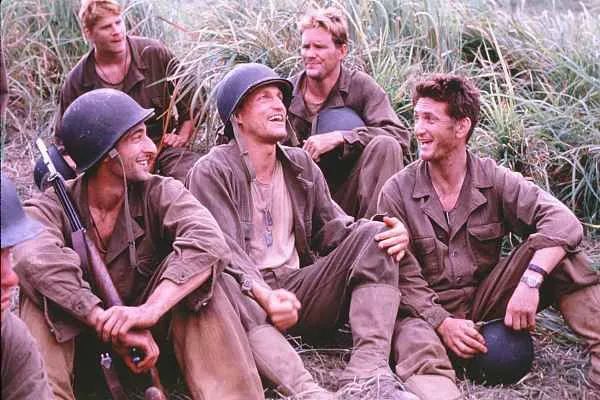 約翰·托爾:我當時在田納西州工作,泰倫斯住在德克薩斯州的奧斯汀,所以我專門去了一趟那里,我們花了一天的時間討論《細細的紅線》這個項目。我們聊得很愉快,我們也不知道最后會談到哪里,總之是在漫談。我發現泰倫斯是一個非常低調、有風度、謙遜的人,他總是說,“好吧,我是這么想的,你覺得怎么樣?”他從來不會強硬地說,“好吧,我們要做這個,這個,還有這個。”他并沒有從一開始就對事物有一個明確的定義,但他的直覺很靈敏,知道他想要的東西會往哪里發展。細節也是他邊走邊發現的。他能感覺到我們漫游的方向,能夠看清它,并且知道當他朝著最終的目標前進時,要做什么事情也愈發清楚。他認為在你接近目標之前,細致地制定好規劃是沒有意義的。