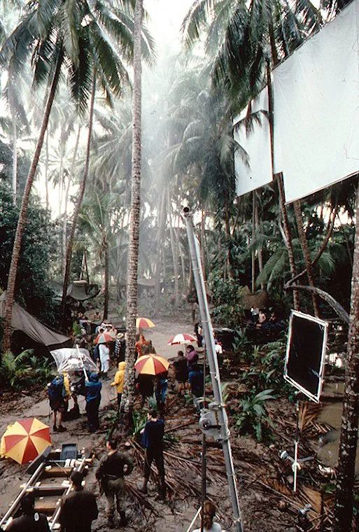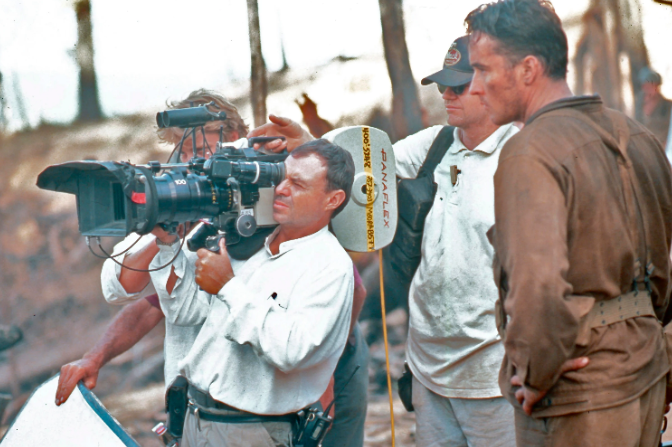 約翰·托爾:所有的器材都來自洛杉磯的潘那維申。我們拿了幾臺輕量級的鉑金相機機身,一臺用于穩定器,一臺用于手持設備。我們的第二攝影組由Gary Capo負責,他有幾臺Panastars和一臺Arri。在鏡頭方面,在斯坦尼康上我們使用了Primos和C系列鏡頭。我們也有3:1和11:1的變焦鏡頭,但我們并不常用。《細細的紅線》幾乎是一部全廣角拍攝出來的電影,所以我們主要使用更寬的鏡頭拍攝,比如40mm和50mm。我們的特寫主要是用75mm或100mm的鏡頭。我們不斷地爭取把盡可能多的地理環境拍進畫面。每當我們戴上一個更緊的鏡頭時,就會覺得好像少了點什么。