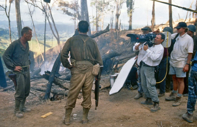 約翰·托爾:我很喜歡片中飾演那個瘋狂上校的尼克·諾爾特(Nick Nolte)和他的副官約翰·庫薩克(John Cusack)之間的一段情節。這個場景發生在戰斗進行到一半時,諾爾特告訴庫薩克不要擔心士兵的死活,要集中精力向山上沖鋒。我們當時在一座山頂上,周圍都是被炮彈摧毀的樹干,這個場景非常適合外化角色的內心想法。為了在這個場景拍清楚演員的面部表情,我們選擇了一個光線充足的角度拍攝,并且生了些煙來軟化刺眼的陽光,也為鏡頭增加了一點動態。總之我們既想要展示環境,也想要創造完美的拍攝角度。這是我和泰倫斯的共識,因為那里的風景實在是太棒了。