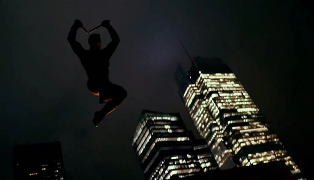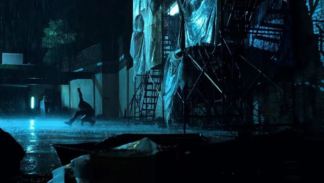 “接下來,打斗轉到了外景的一處腳手架上,這個架子是洛倫搭的,既是布景,又是真實的,架構起兩個地點,”攝影師說,“腳手架上面放了一個相當實用的頂棚熒光燈,以及4英尺的Kino白色冷光燈,包裹在散射性的塑料罩之中,至于街道,我們用了阿萊M90輕量級9K HMI和Max反射器來創造大雨的效果。”
