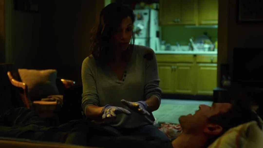 “這是全劇最黑暗的一幕,也是我拍過的最黑暗的東西,”洛伊德說,“我們開始于凱倫的臥室,人們正對著窗戶,在一片黑暗中打斗,每扇窗戶的上方都有一個光線高度分散的阿萊T12,正面有一個凝膠包,里面充滿水銀蒸氣,形成了光池和長槽形光,家用燈泡調暗至IRE0度以上。”