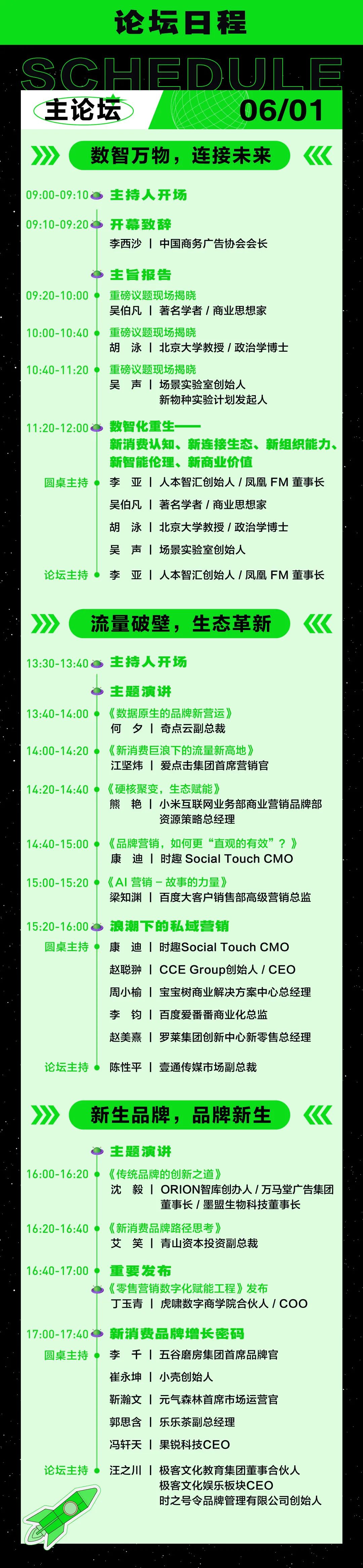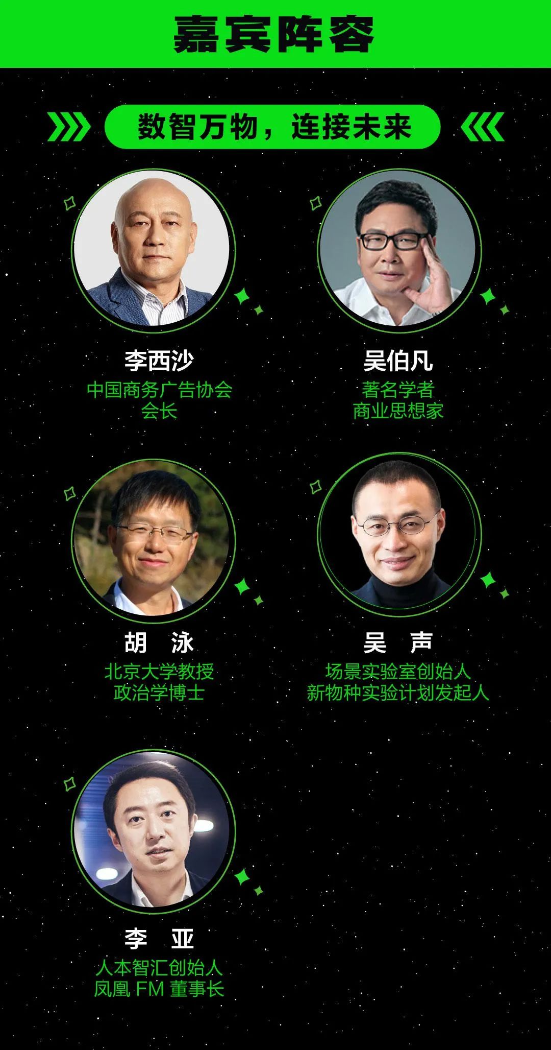 除此之外,在開(kāi)幕論壇當(dāng)中,我們重磅邀請(qǐng)到了四位跨領(lǐng)域行業(yè)專(zhuān)家,包括著名學(xué)者/商業(yè)思想家吳伯凡、北京大學(xué)教授/政治學(xué)博士胡泳、場(chǎng)景實(shí)驗(yàn)室創(chuàng)始人吳聲及人本智匯創(chuàng)始人/鳳凰FM董事長(zhǎng)李亞,將帶給我們一場(chǎng)跨界視聽(tīng)盛宴。