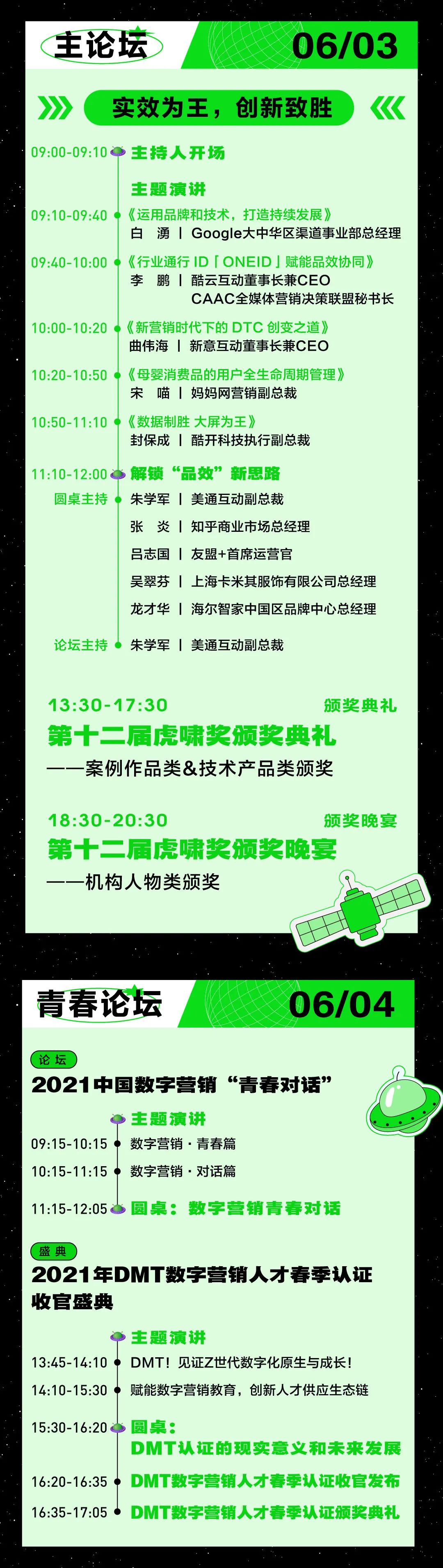 今年的虎嘯盛典,依舊由中國(guó)數(shù)字商業(yè)傳播論壇、各大平行論壇和虎嘯獎(jiǎng)?lì)C獎(jiǎng)典禮、DMT數(shù)字營(yíng)銷(xiāo)人才認(rèn)證春季收官典禮等組成。