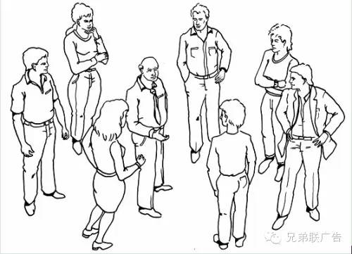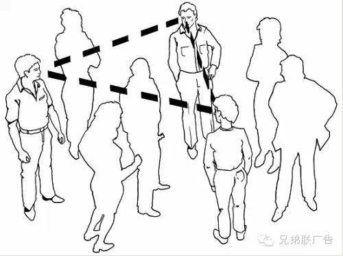 在示圖11.4中,相同的邏輯也可運用在四個主要的演員上。在這種情況中,我們有多重視線,或潛在的動作軸線,我們可能為每對演員的拍攝機位苦苦思索,但 其實是有更簡單的調度方法的,即限制你自己在幾個主要的機位上就好了。如果你在一大群人中,建立了多于四條的視線,以便在其中移動,你就是在制造不必要的 麻煩。示圖11.4中的虛線代表了一條基本的動作軸線,可用來拍攝特寫、單人鏡頭、雙人鏡頭和團體鏡頭,這意味著我們建立了一個基本的觀看方向。