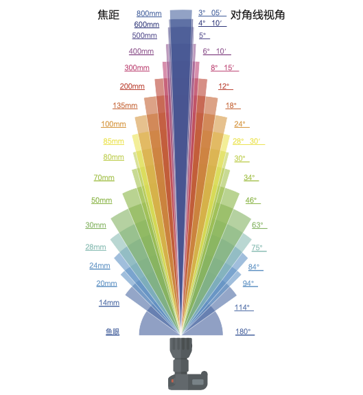 簡單說就是一個鏡頭的視野。上篇文章我們講了35mm相機或者說135相機是什么。焦距按照等效35mm相機焦距來說,與視角的關系如下。