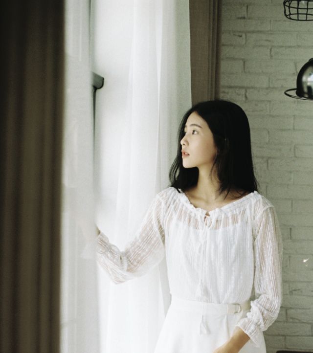 窗簾或是白色的墻體也是一個(gè)很好的前景。讓主體人物置身于畫(huà)面的中間層,畫(huà)面會(huì)顯得層次豐富,主體突出。尤其是在室內(nèi)拍攝的時(shí)候,常常會(huì)用到這種構(gòu)圖方式。在前期考察場(chǎng)景時(shí),如果發(fā)現(xiàn)沒(méi)有窗簾,也可以自己帶上一塊合適的布去制造前景。