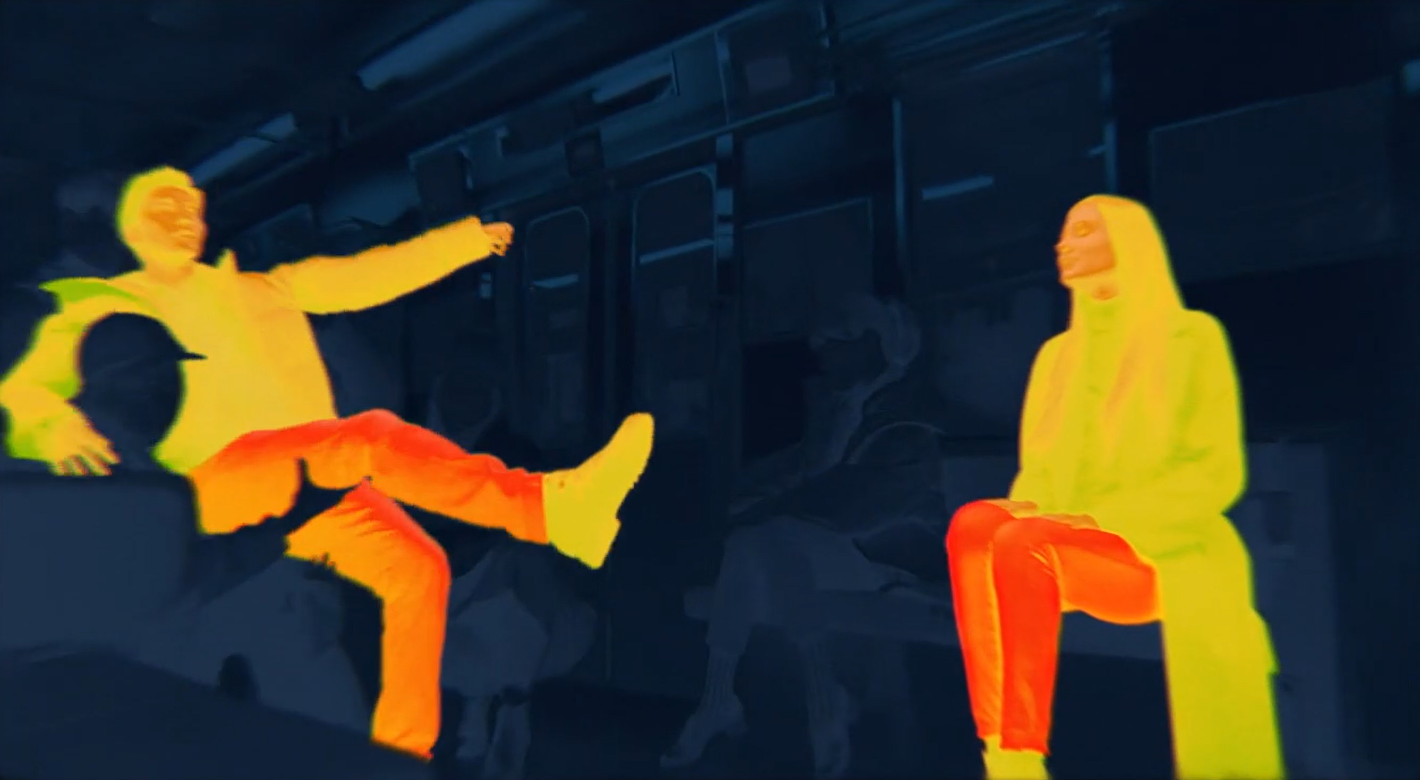 在視頻拍攝過程中,一部分畫面采用“熱感應成像”的方式來表現,讓人感覺舞者的體溫與周圍其他人的體溫不一樣;舞者還運用了大范圍的舞蹈動作來表現褲子有很好的彈性。不僅如此,演員的服裝也為大家的冬季時尚搭配提供了參考。