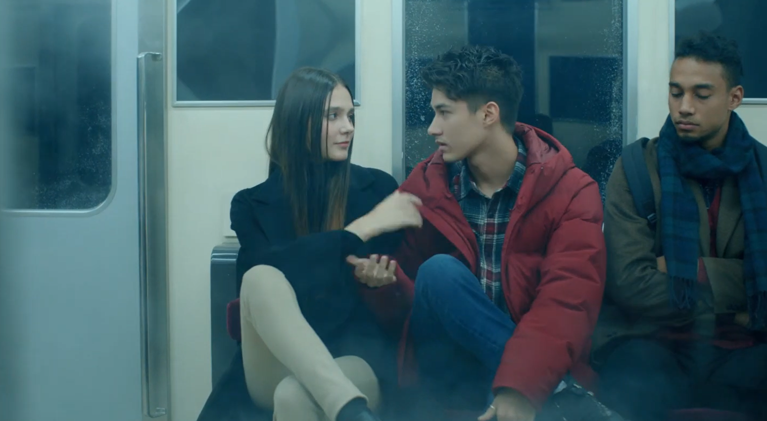 視頻中,男子走進車內,看到女子后坐下。冬天溫暖的舞曲開始了。